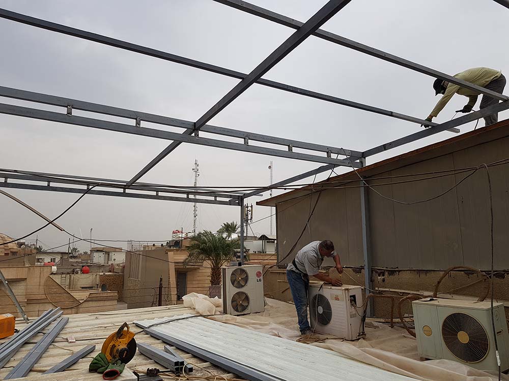 اعمال تجهيز الحديد وانشاء مظلة فوق سطح البناية .